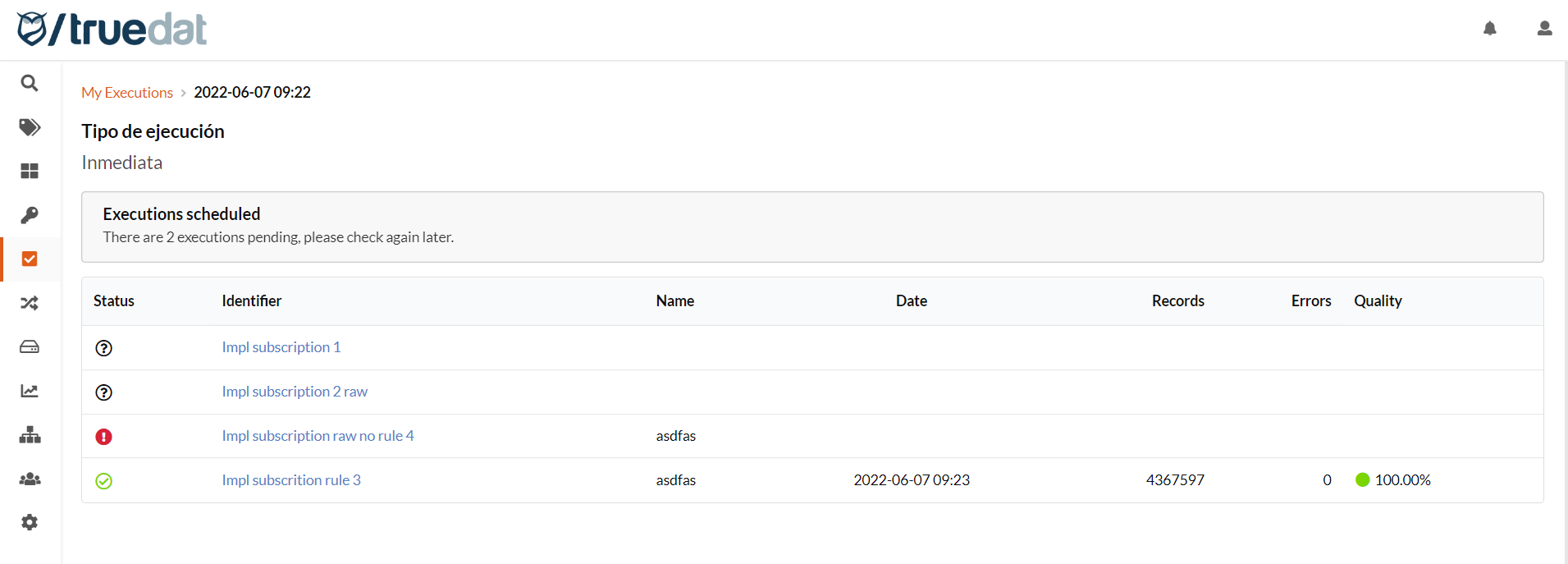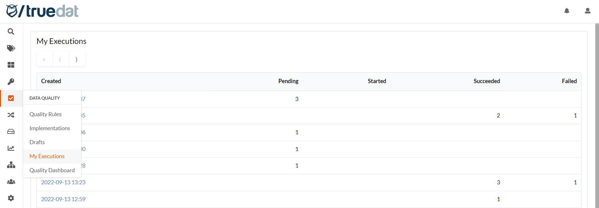 There is a new menu option: “My executions” under "DATA QUALITY", where you can see the last 50 quality execution jobs you have requested, when they were run and the status of the quality controls executed (pending, started, succeeded and failed). This menu item is only available to users with permissions from the group of permissions "Quality Implementations Additional Actions".