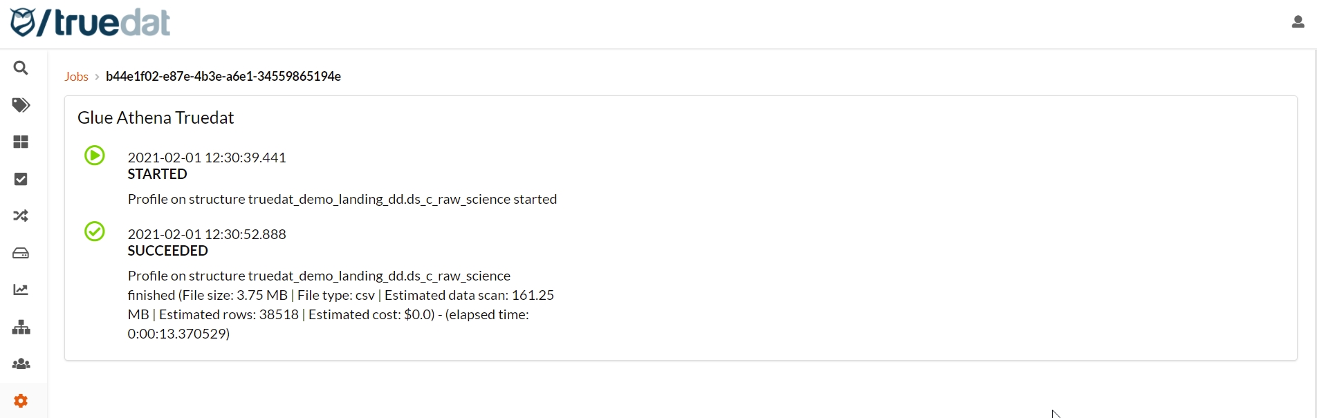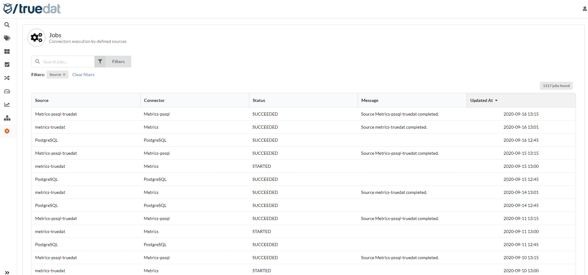 In this module admin users will be able to monitor the execution of the jobs that extract metadata or execute quality rules or perform profiling on the the different sources configured in the application . For this, a list is displayed with the execution results of all the sources sorted from most recent to oldest.