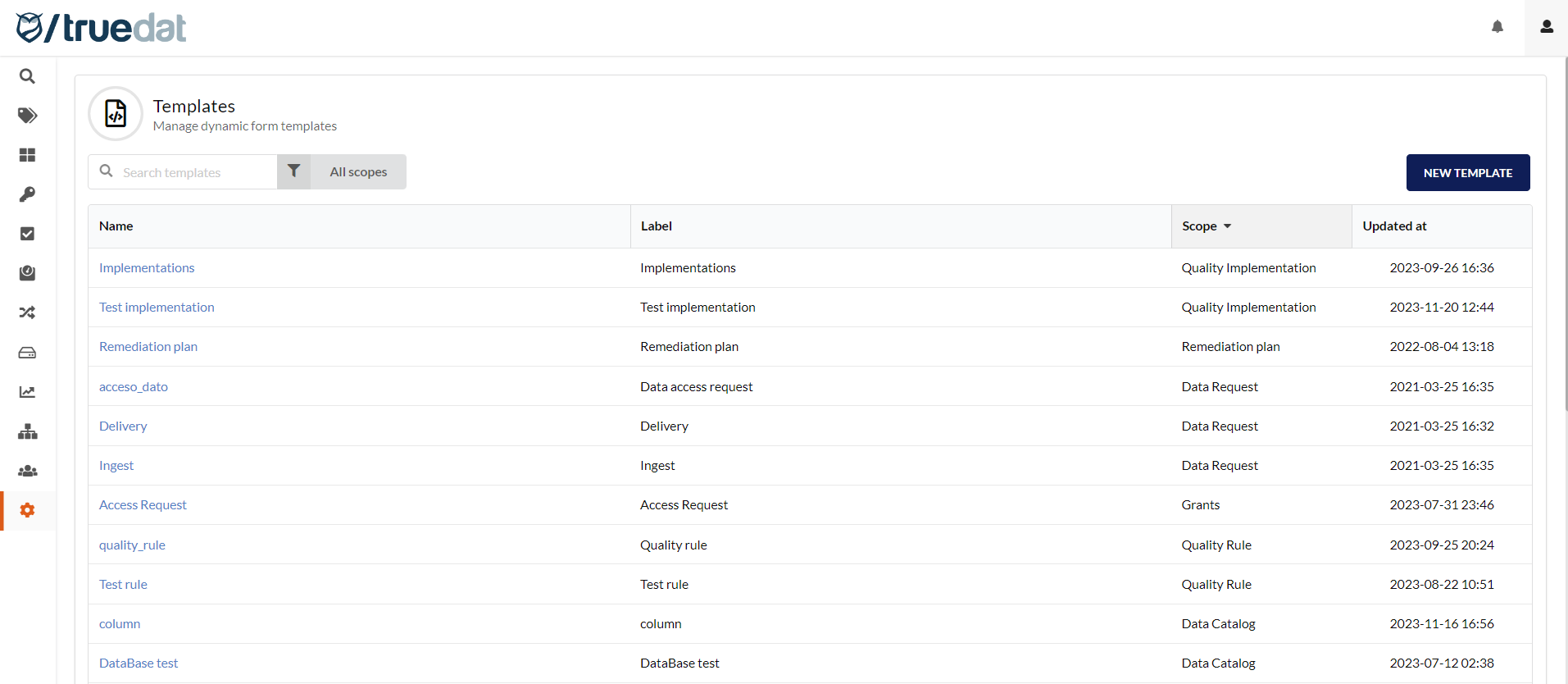 Truedat contains an administration module to manage dynamic forms to be used by different type of documents within the application. This will allow the administrator to customize the fields to be displayed in different features. We call the definition of this forms template.