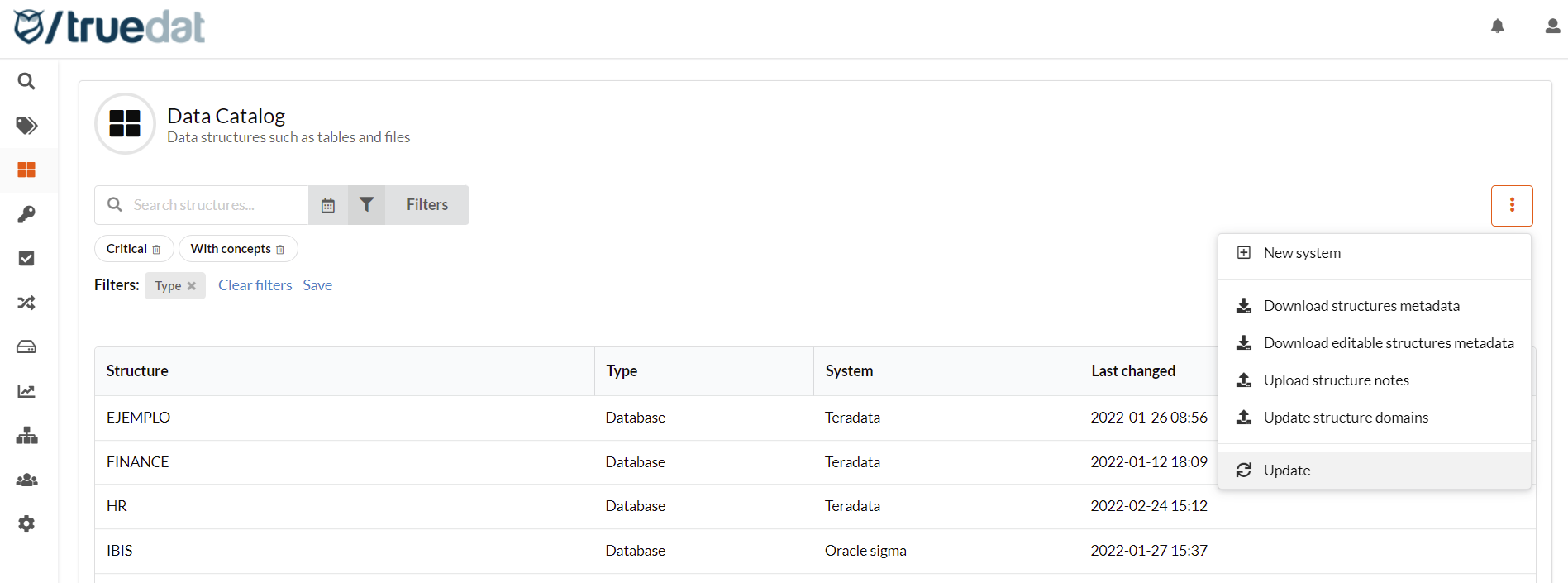 Only one type of structure can be updated in each action. On the main screen of Structures in Data Catalog, you have to filter by the Type of structure to be updated and then on the menu on the right-hand side click on 'Update'.