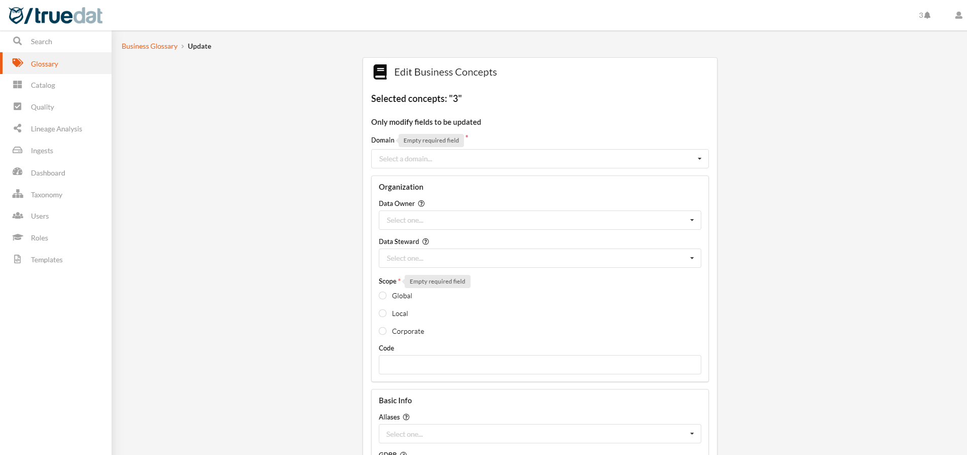 From the main screen of the Business Glossary, admin users will have the option to perform a bulk update of concepts. In order to carry out this update, the following considerations must be taken into account: