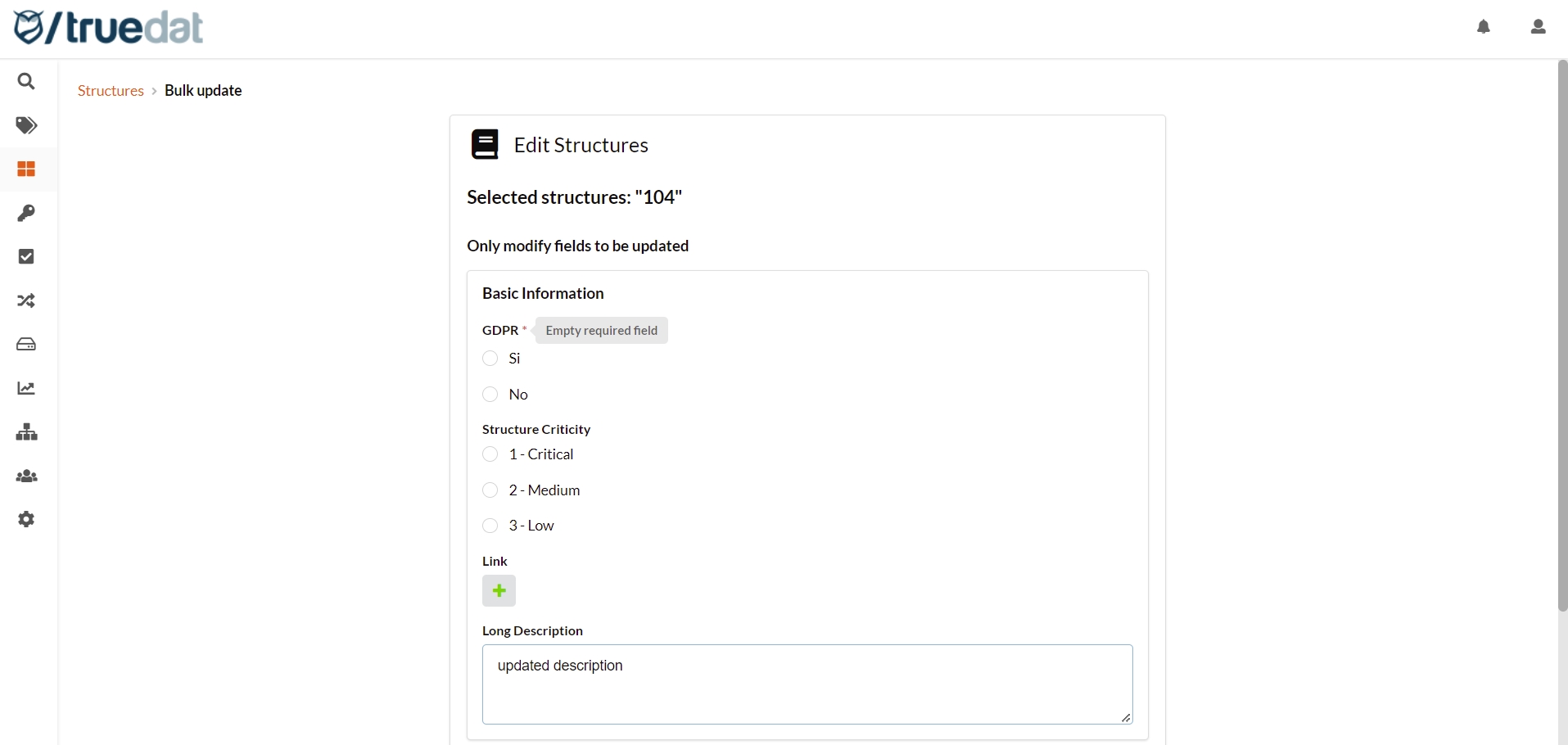 All fields are optional and only those for which a value is entered will be updated on the structure. All the fields of the template / type by which it has been filtered will appear.