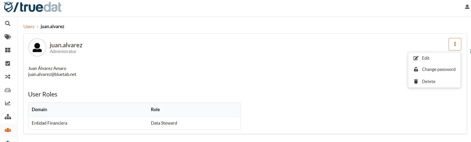 By clicking on the user name, we will access the details of the user and we will be able to consult the user's data and in case of having an assigned role we will see in which domains it has it either by user assignment or membership of a group.