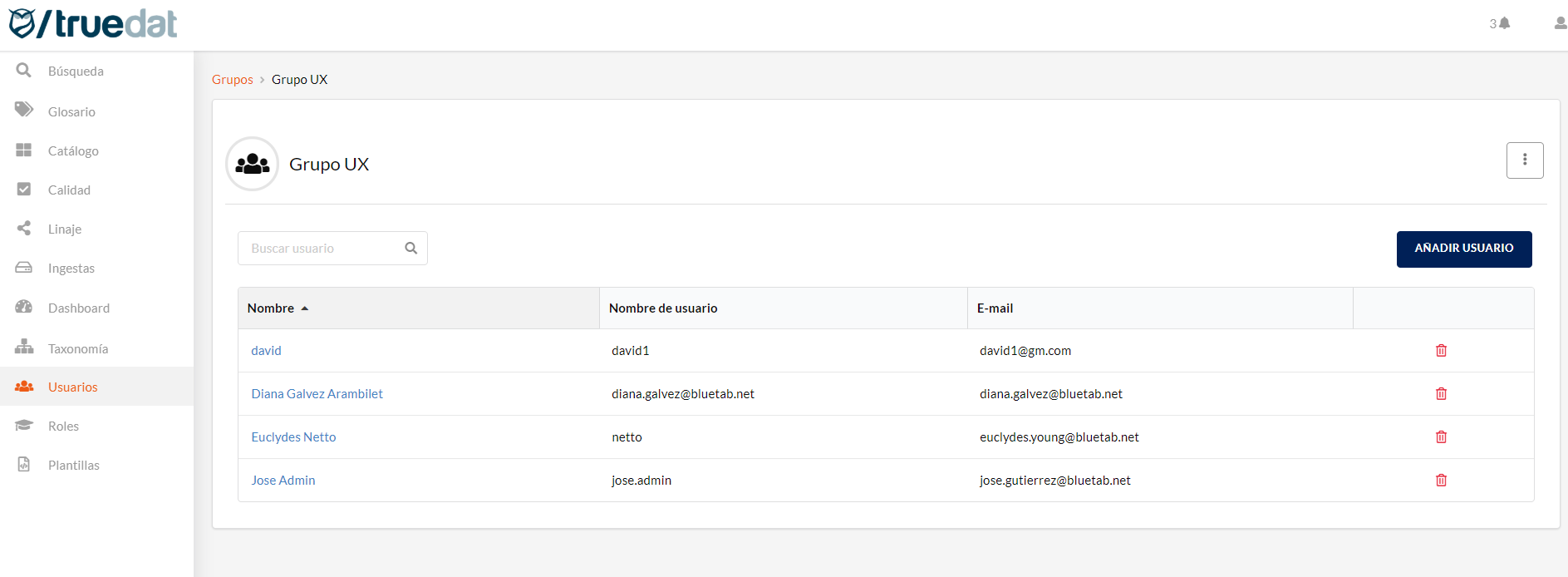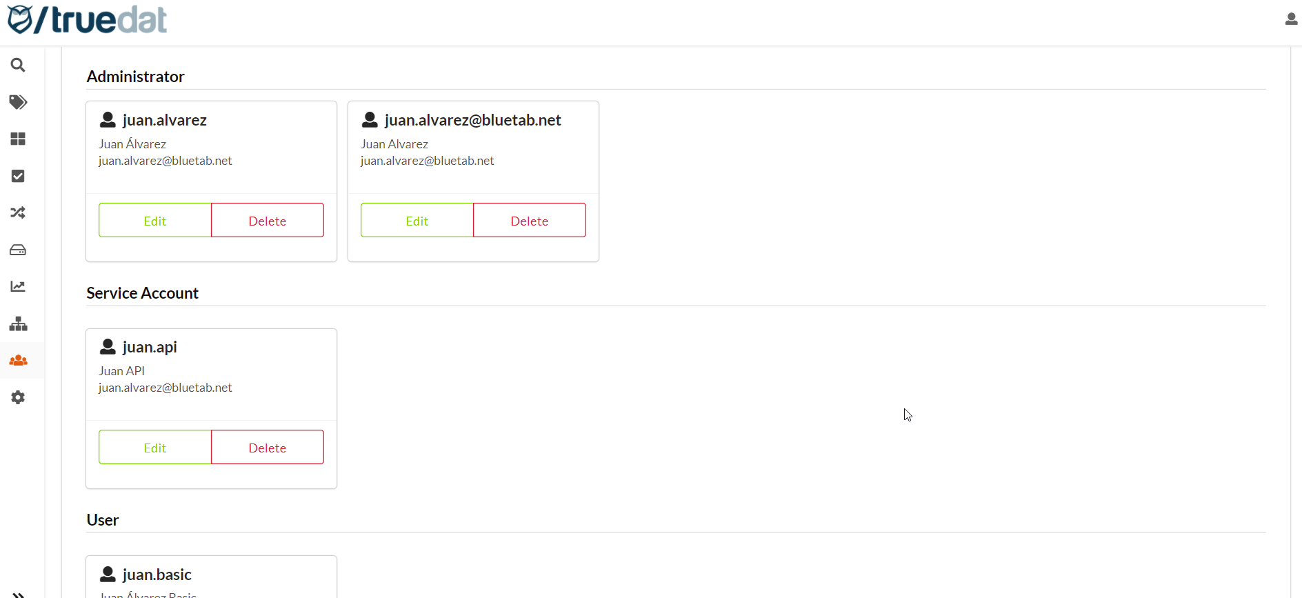 This section of the Truedat administration module allows the creation and management of users and groups. Users can be created directly in this administration screen or through integration with an authentication service (active directory or similar). This section describes how users are manage directly in the application and does not cover the integrations with authentication systems.