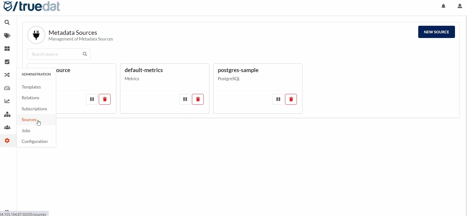 In Truedat you will be able to use different connectors depending on your installation. In order to know which connectors are available for you, create a new source and you will see the connectors installed in your application. Once you select your type of source you will need to input the required information for the selected source.