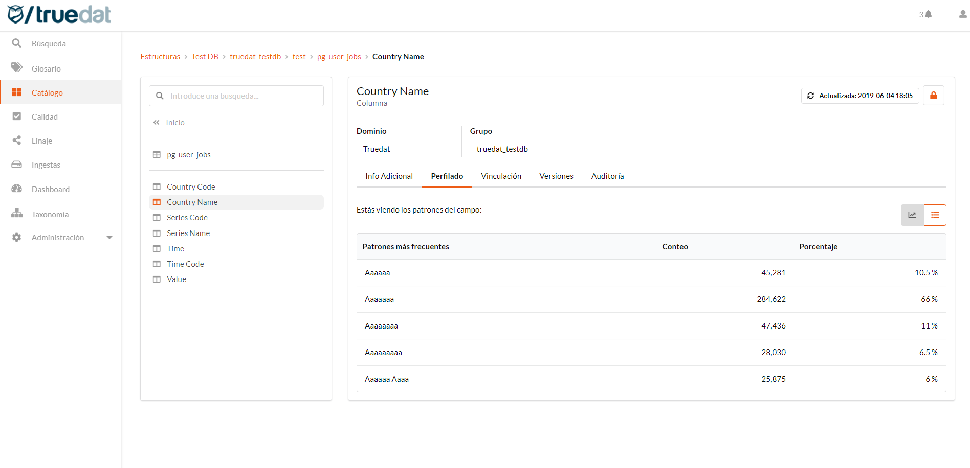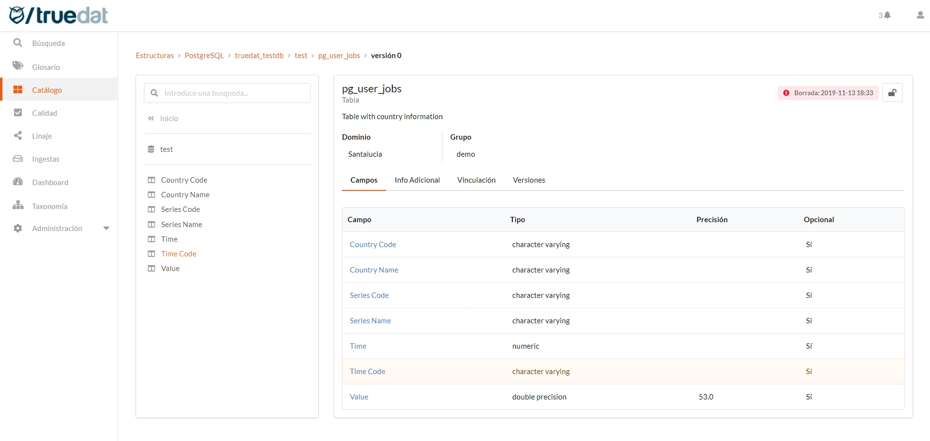 This module allows the consultation and enrichment of metadata obtained from the organization's systems. For this, search, filtering and browsing options are provided through the catalog. Additionally, this module connects with both the glossary of concepts and the data quality glossary to allow navigation between the different modules.