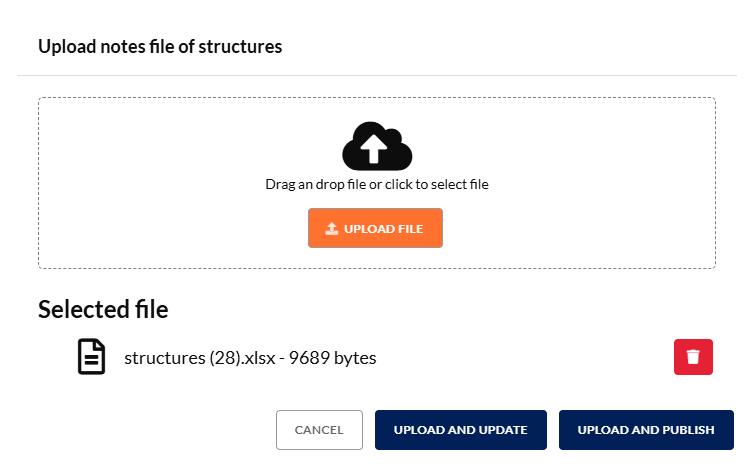 You will be able to download a file with all the published notes information for the structures. This file will download in the same format that you need to upload the information and it is used to easily modify notes information in a bulk way before uploading it again.