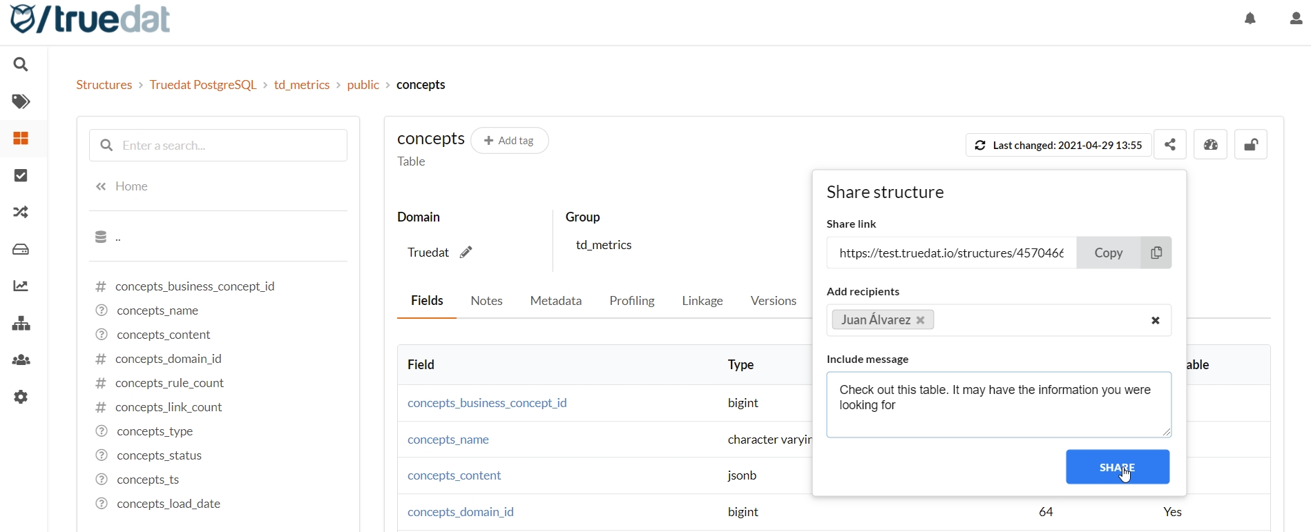 You will be able to share your structures with others using the corresponding action on the right upper corner of the structure information. This will produce a notification and an email for the users specified in the form.