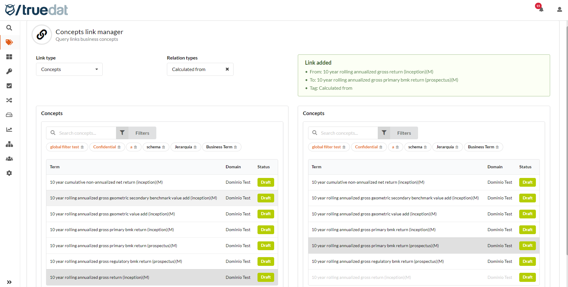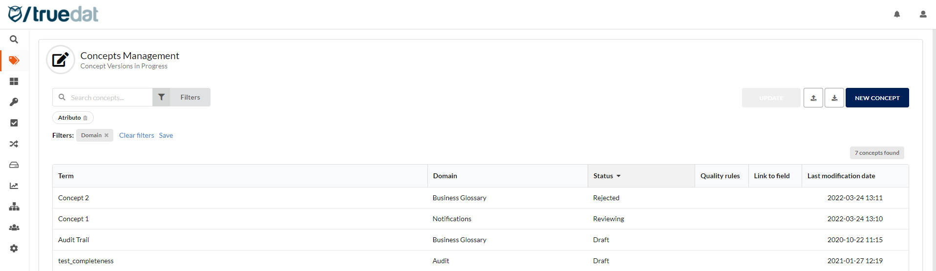 Filter: It will allow you to filter by domain, status, type (template) and linked to data fields, as well as all the fields configured in the business concept template as a list of values. Filters will only be shown for those fields in which there is more than one value.