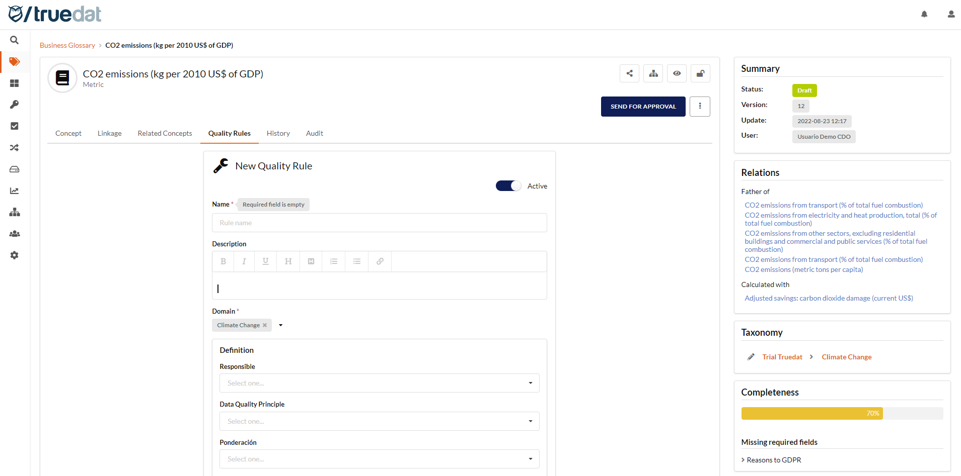 The template may include some additional fields that although not mandatory to be able to publish the concept, they are desirable to have a complete definition of the business concept. Only those concepts where all the mandatory and optional fields are filled in will be shown as 100% completed.