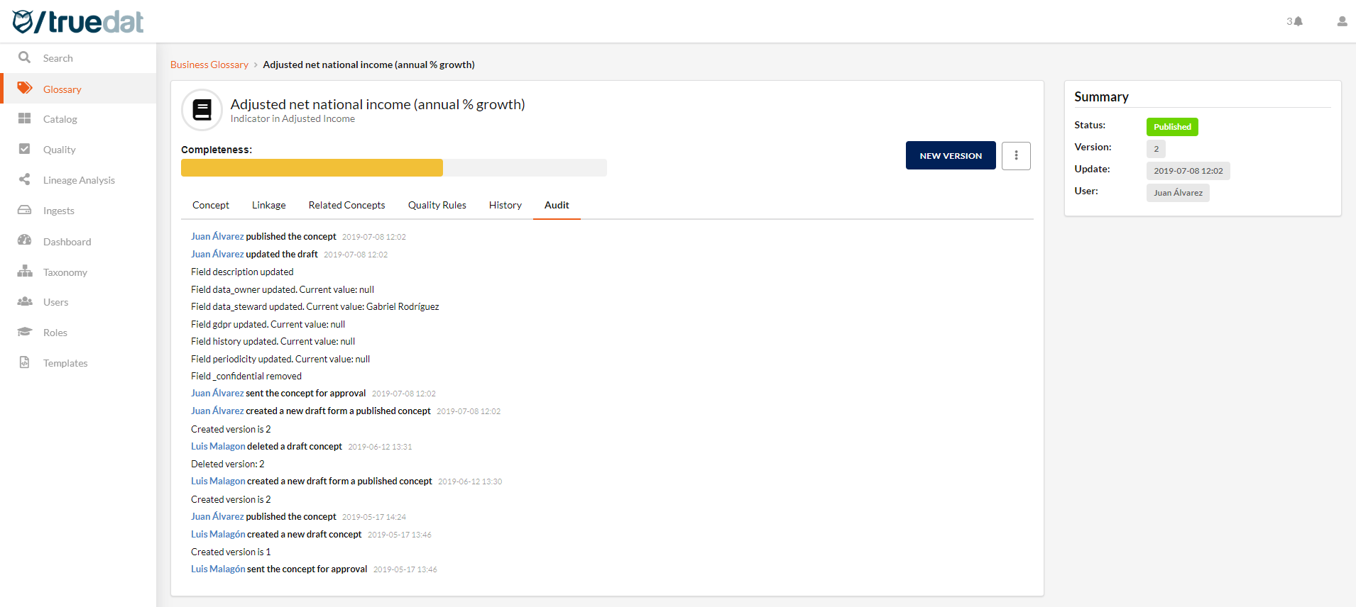Lastly, the Audit tab shows the details of all the actions and related changes on the concept. You can see what, when and by whom.