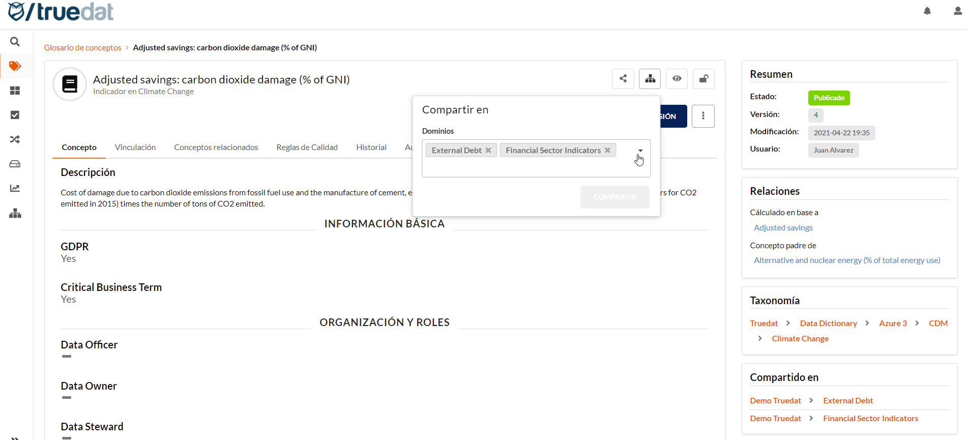 This feature is focused on multiorganization installations in which multiple glossaries are managed. Usually in this cases there is a corporate domain where cross Business Concepts are defined. Using the sharing functionality users with the corresponding permissions will be able to share with other domains. This will allow any user with permission to view concepts in the shared domain to see this particular concept.