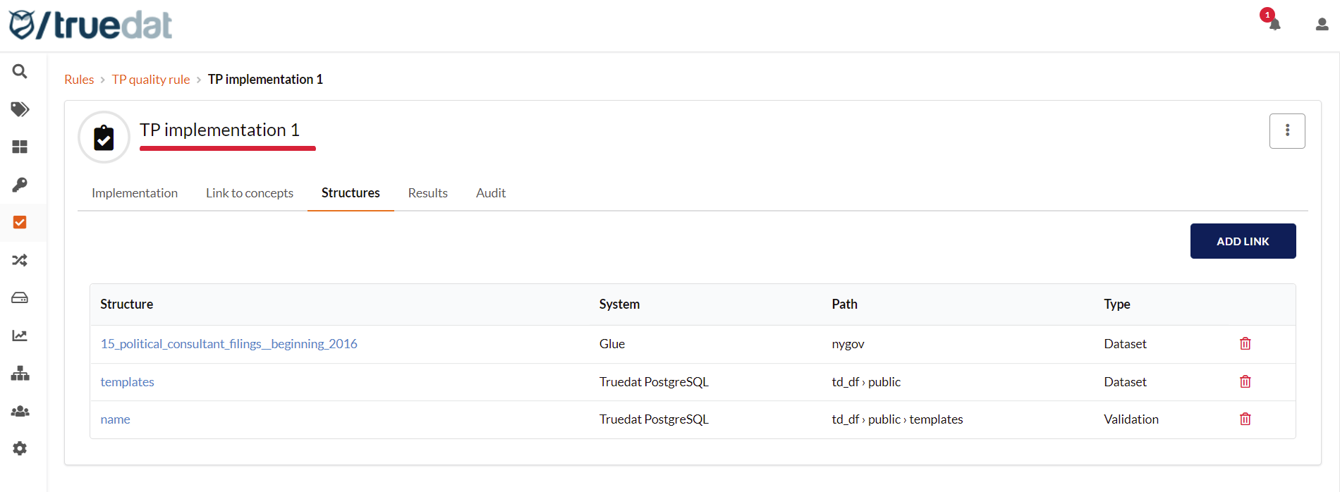 In the quality implementations details screen, in the tab "Structures" you can see the links to data structures. When a quality implementation is created, the structures linked to that implementation are automatically detected: