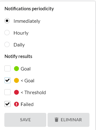 From the Quality implementations details screen you can subscribe to receive notifications when results are generated in a similar way as done with data quality rules by clicking on the button and selecting the frequency of the notifications and the type of result.