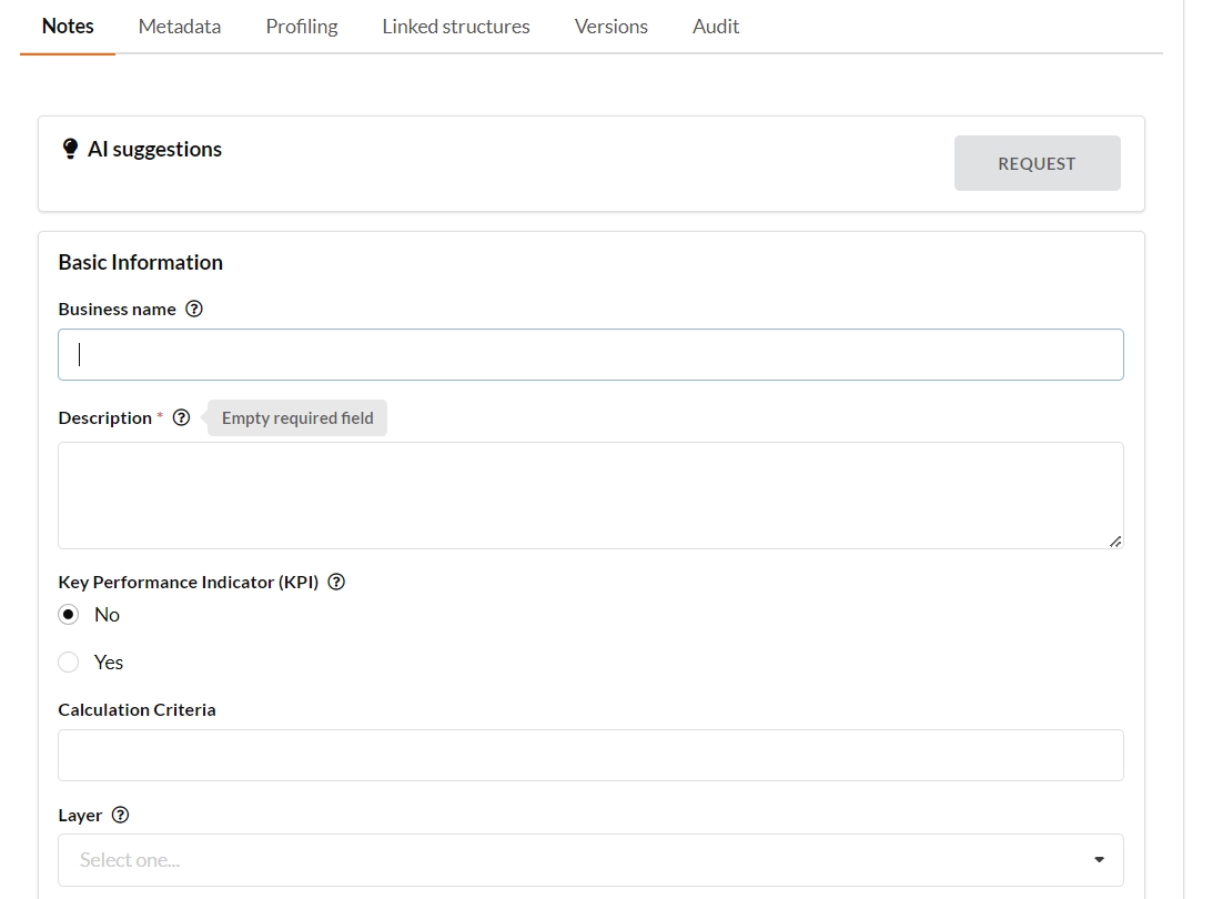 With the help of generative AI, you can fill in Notes forms in the Data Catalog. Once in the structure's Notes tab, when creating or updating a note you will find a button to obtain 'AI suggestions'. The AI generated content can be then reviewed and then decide whether to use it or not.
