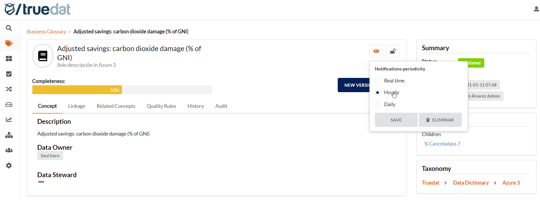 Users will be allowed to subscribe to any concept and be notified of any changes produced to that concept. It will be possible to choose to receive the notifications as daily ingest, one hour after the change has been produced at most or inmmediatily when changes happen.