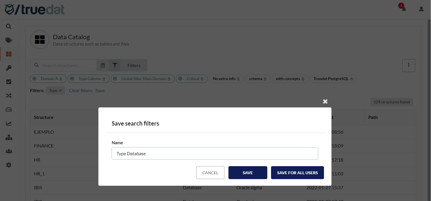 An administrator can create search filters in the Data Catalog and save them so all data catalog users will have them available by default when they access the catalog. Only the administrator can delete these global search filters. Users can view and use global filters and can still create and save their own personal search filters.