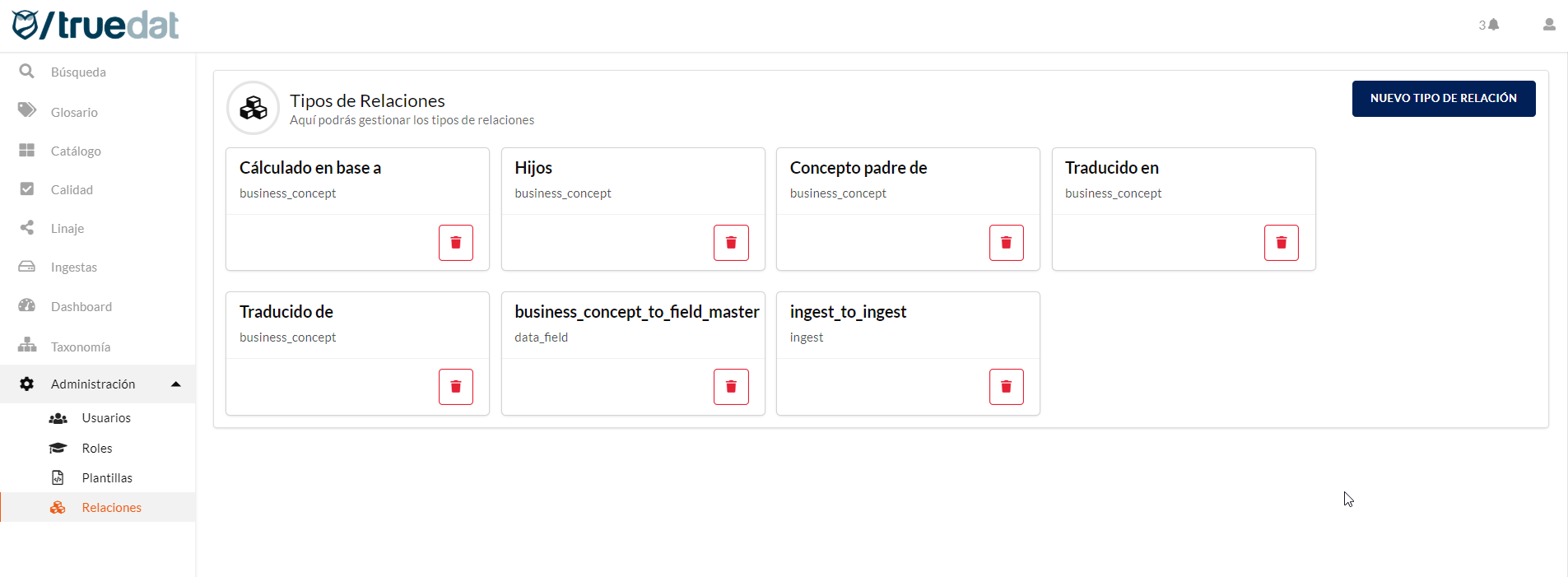 A relationship type can be deleted so it can no longer be used when linking resources. This deletion will not cause the deletion of existing relationships of this type but existing relationships will continue to exist without any type. For example, if we have a concept linked to a structure with a master type and we delete the master relationship type, the link will continue to exist but will not be marked as master.