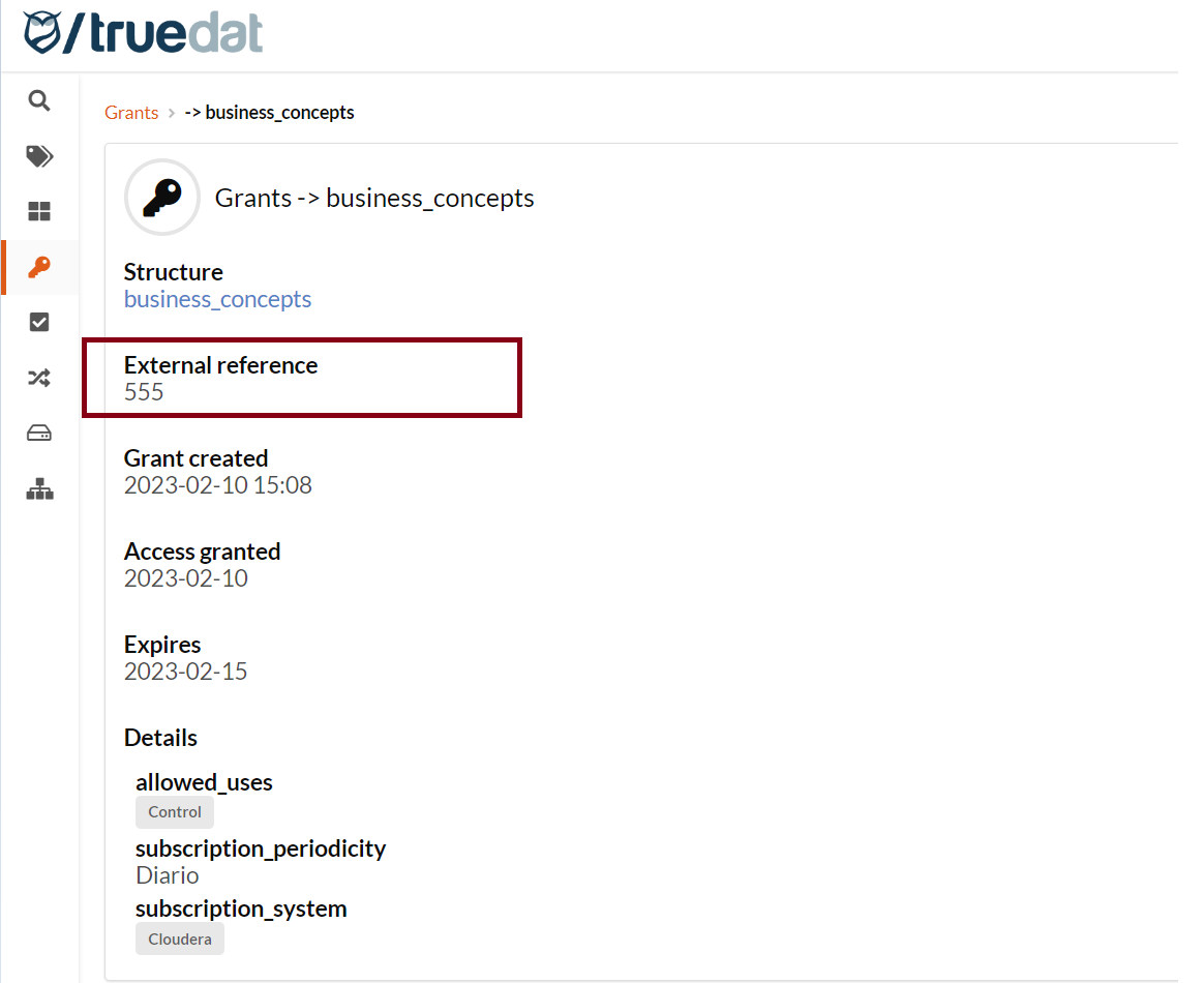 When creating new grants in Truedat, a unique reference can be included to ensure that no duplicated grants are created. This reference field must be provided by the external system that manages and grant access to the data. Truedat will consider a grant to be duplicated if it is for the same user, same structure, in the same dates and with the same reference.