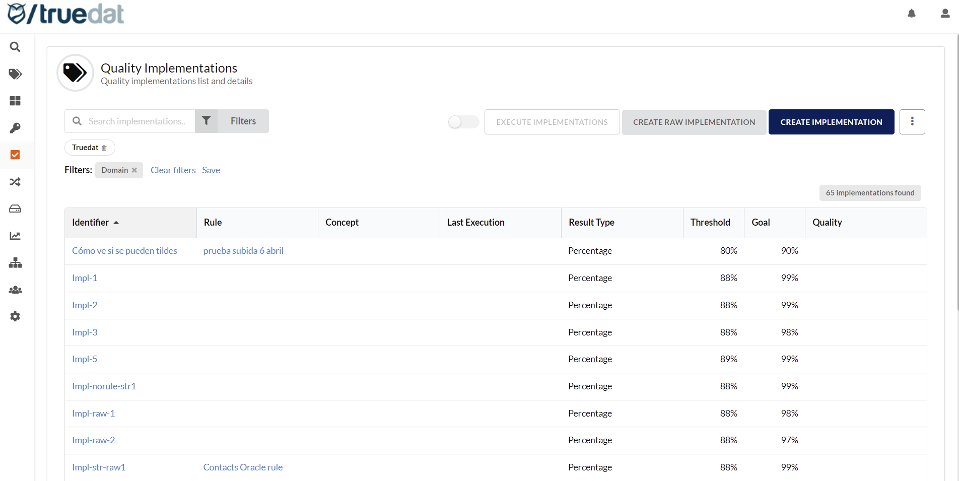 Quality Implementations can be created without having to link them to a functional quality rule. Truedat will support both models: having quality implementations linked to a quality rule, and standalone quality implementations. However, initially, in each installation only one model will be supported, either implementations with rules or without rules. In a future release it will be possible that both models co-exist in Truedat so in an installation you will be able to have implementations of both types: linked to a rule and standalone.
