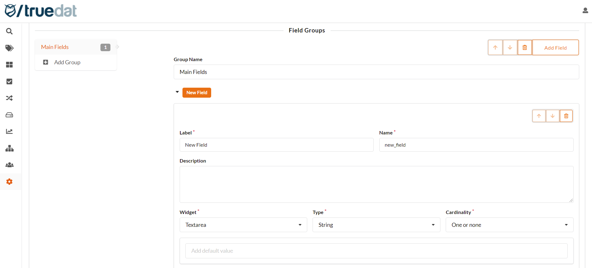 Truedat contains an administration module to manage dynamic forms to be used by different type of documents within the application. This will allow the administrator to customize the fields to be displayed in different features. We call the definition of this forms template.