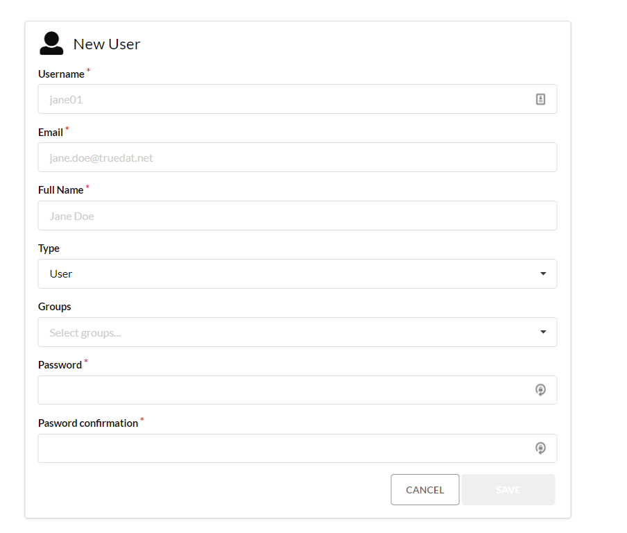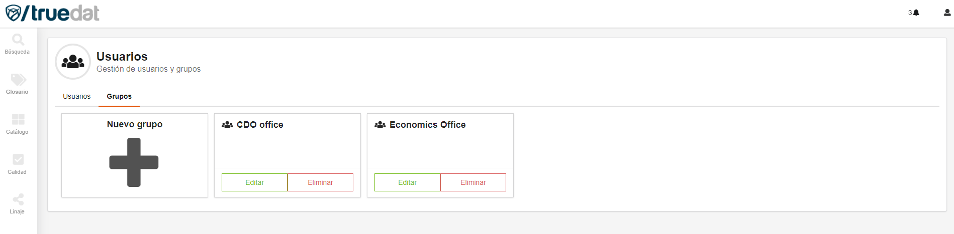 This section of the Truedat administration module allows the creation and management of users and groups. Users can be created directly in this administration screen or through integration with an authentication service (active directory or similar). This section describes how users are manage directly in the application and does not cover the integrations with authentication systems.