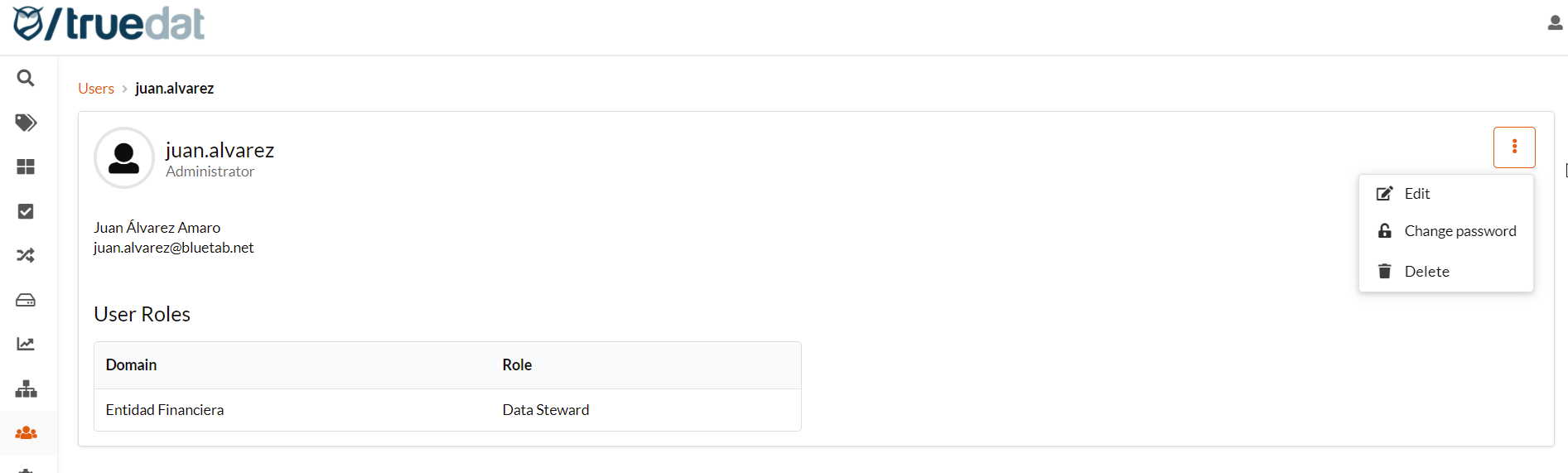 By clicking on the user name, we will access the details of the user and we will be able to consult the user's data and in case of having an assigned role we will see in which domains it has it either by user assignment or membership of a group.