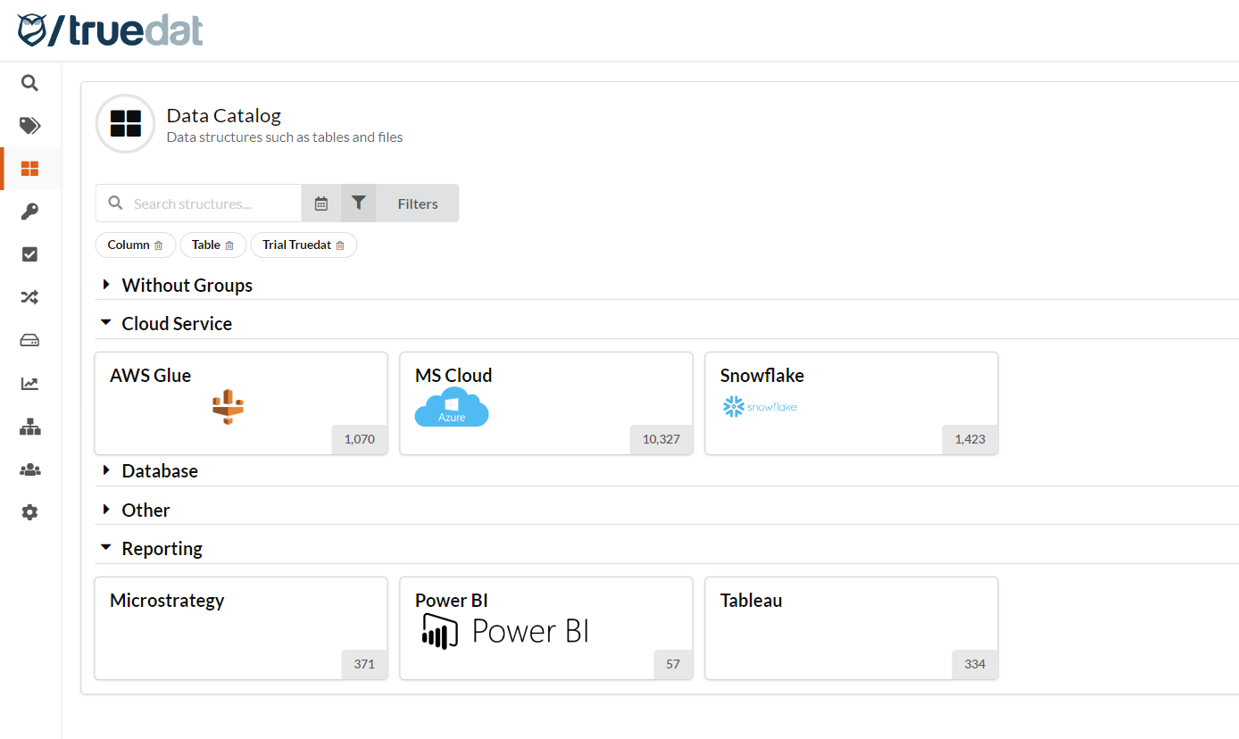 Filtering: You will be able to filter using information discovered from the data source and aditional information documented in your installation using the data catalog templates. In order to filter by technical metadata fields, these need to be configured by an admin user in structure types screen. Some filter examples: structure type, last changed date, linked to business concept, with/without extra information (notes or functional metadata).