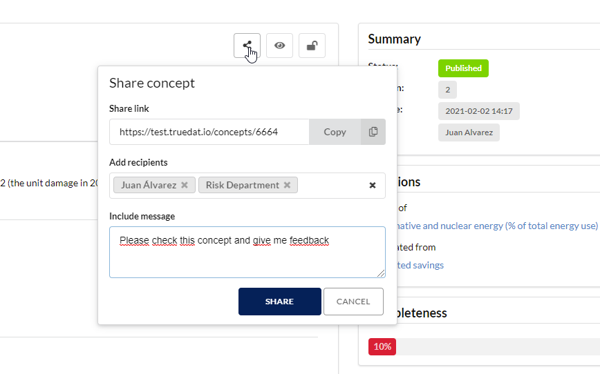 You will be able to share a concept. This action will send a notification and an email to the given users, including the corresponding comment