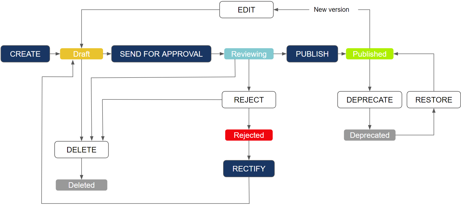 The business concepts are managed based on a predefined workflow which relies on configured permissions. The diagram below shows the application's own workflow for publishing concepts as well as an example of roles and the permissions that each of them could have.