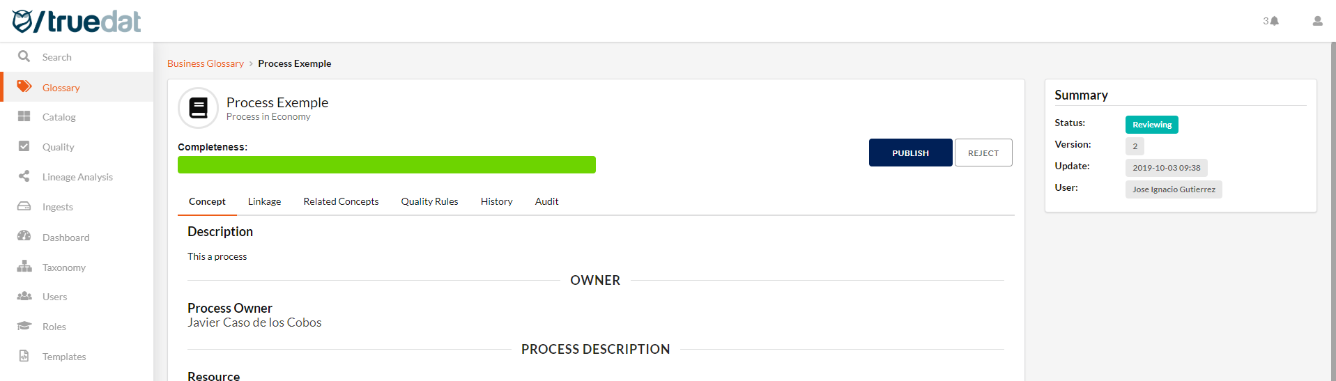 Clicking "Archive" will remove the business concept to remove it from the list of published concepts. This option is used when a published term is no longer used, but it has been previously published and therefore it is not allowed to completely remove it from the system. The application will notify us if the concept that we are going to archive had related information (links and quality rules).