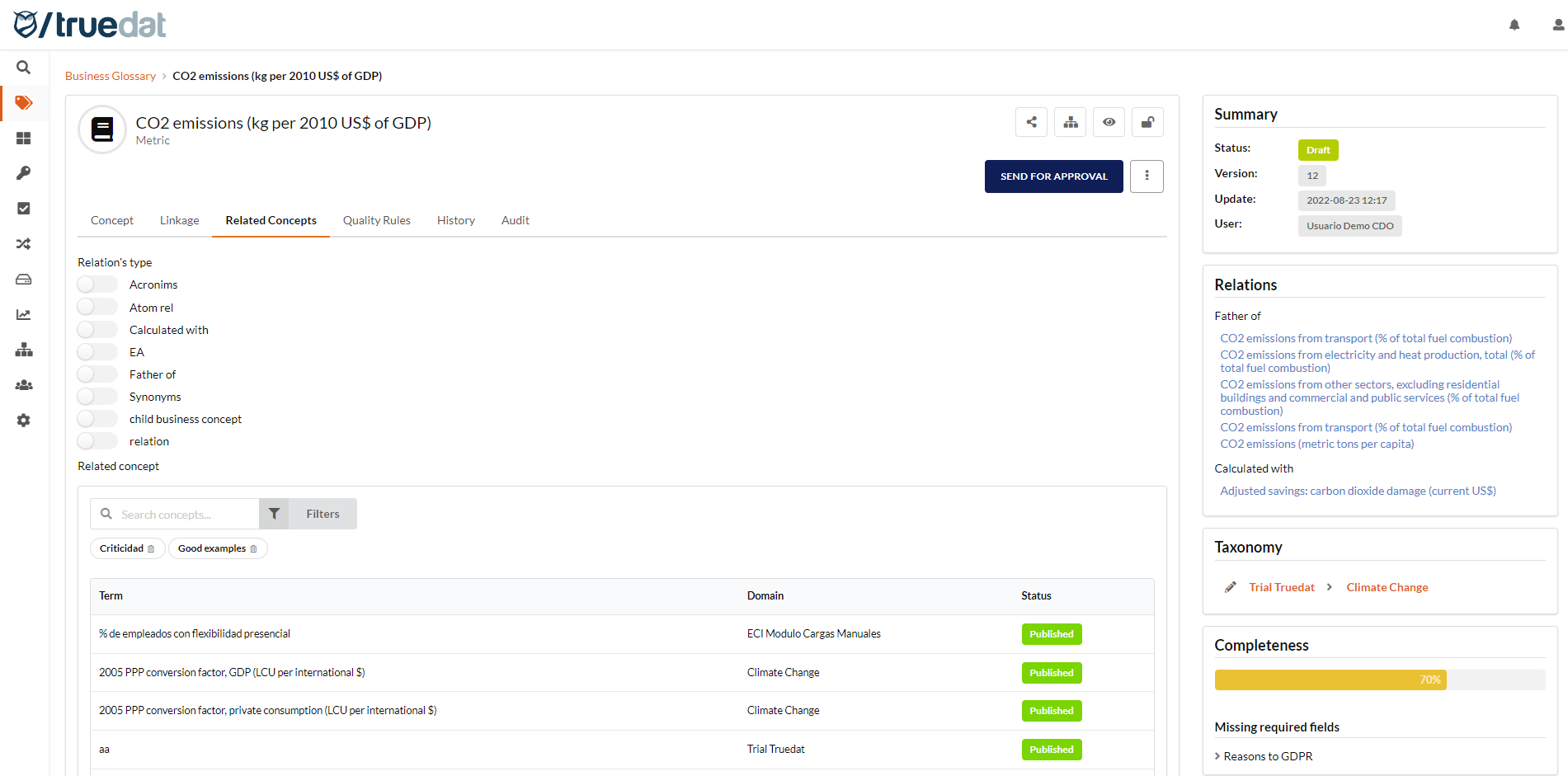 The template may include some additional fields that although not mandatory to be able to publish the concept, they are desirable to have a complete definition of the business concept. Only those concepts where all the mandatory and optional fields are filled in will be shown as 100% completed.