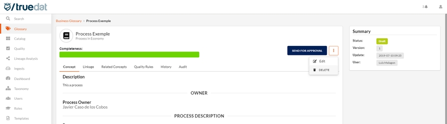Drafts: this view displays business concepts that are either in Draft, Reviewing or Rejected status and require an action from the user. You will only see those concepts you have permissions to carry out any of the required actions (send for approval, publish, reject or rectify).