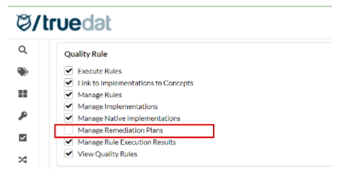 A new permission "Manage Remediation Plans" has been added to the Quality Rule permissions list. This permission has to be given to those roles who will create, edit and delete remediation plans.