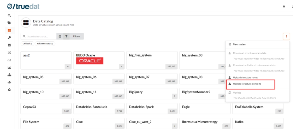 As a Data Catalog manager, holding the permission to 'Manage Structure Domain', you can now upload a csv file to update the domain(s) of multiple structures. In order to do this, go to the Data Catalog main screen and in the right-hand side menu, select the new option 'Update structure domains'.