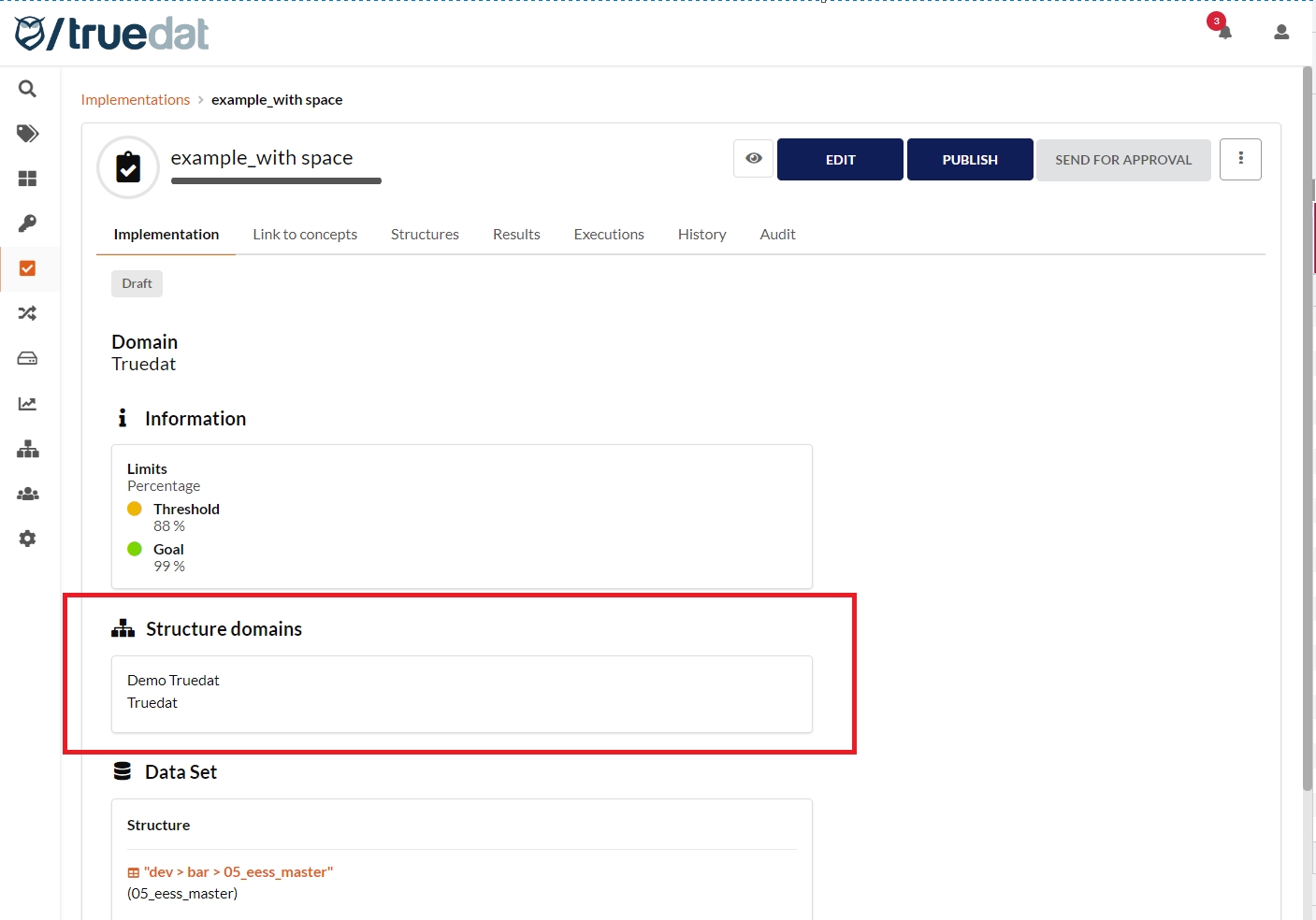 In addition to the domain the quality implementation is assigned to, you will be able to view the domains of the structures involved in the definition of the implementation, both structures used in the dataset as in the validation. This information will be displayed in the details of the implementation and in the download file of implementations and through customisation, it can also be displayed in the implementations list. You will be able to also filter the implementations list by the structure's domain to retrieve implementations defined over structures belonging to a specific domain.