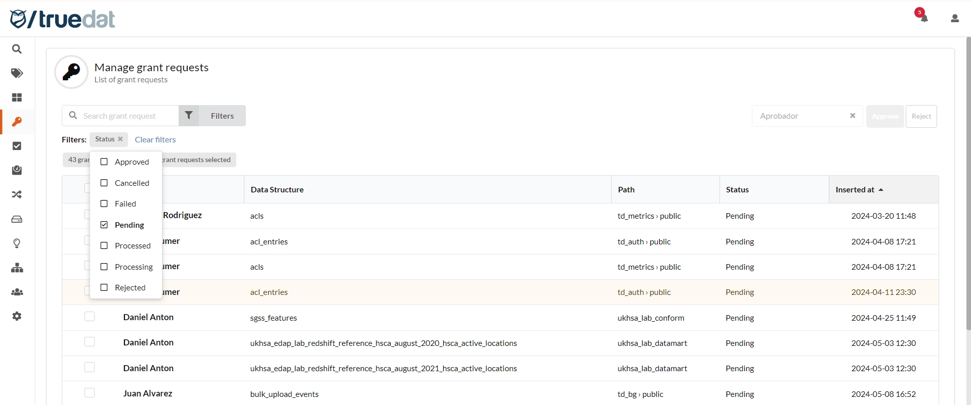 As a grant request approver, you can now view requests that have already been approved/rejected. In the same page where you get the list of requests pending approval, you will also be able to filter the list in order to see those that have been approved or rejected or even any status of the granting access process.