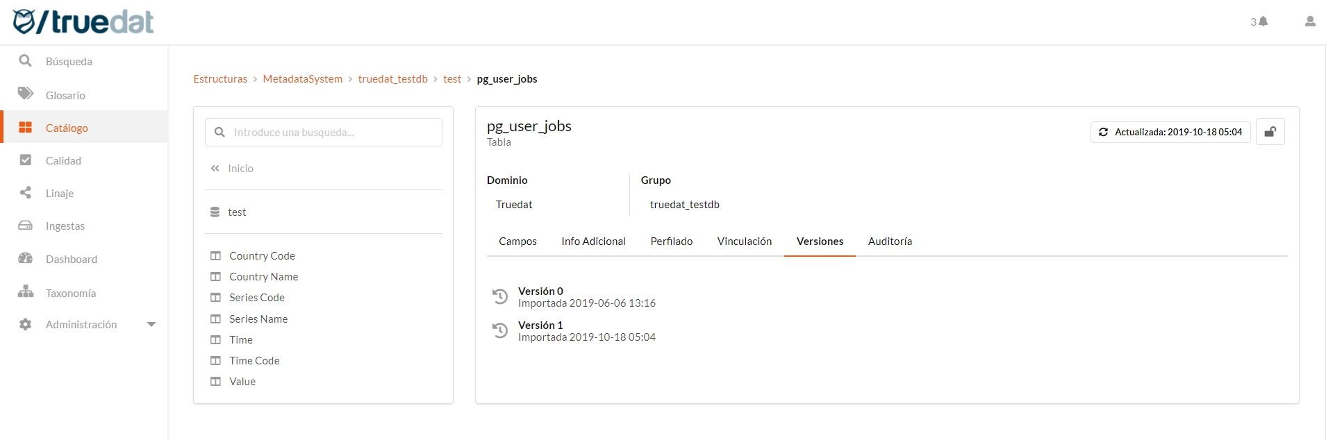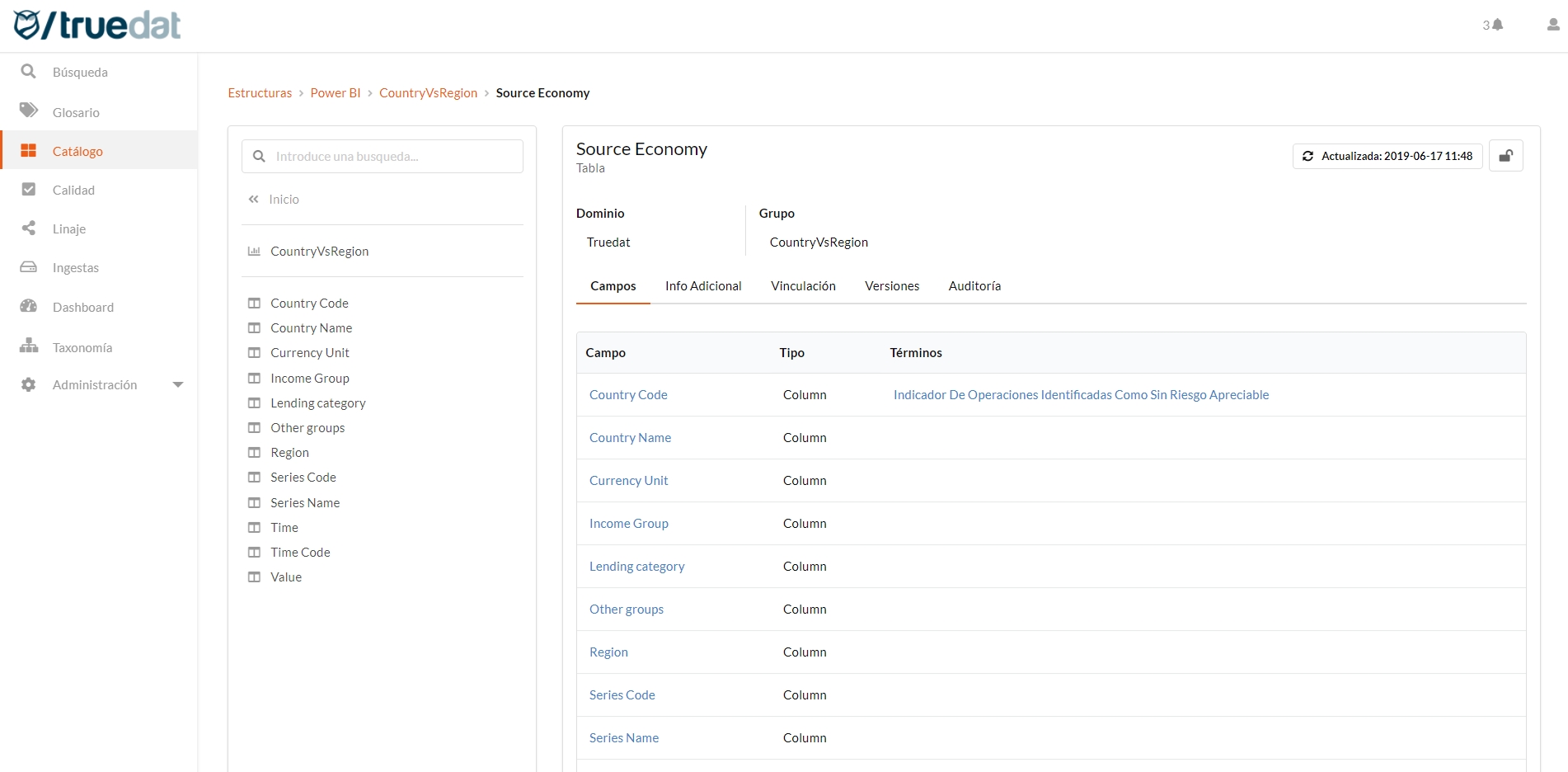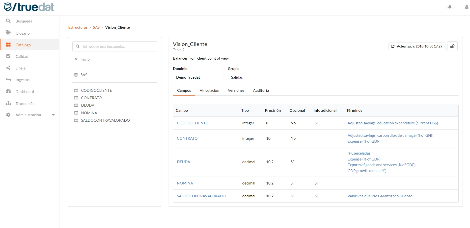This module allows the consultation and enrichment of metadata obtained from the organization's systems. For this, search, filtering and browsing options are provided through the catalog. Additionally, this module connects with both the glossary of concepts and the data quality glossary to allow navigation between the different modules.