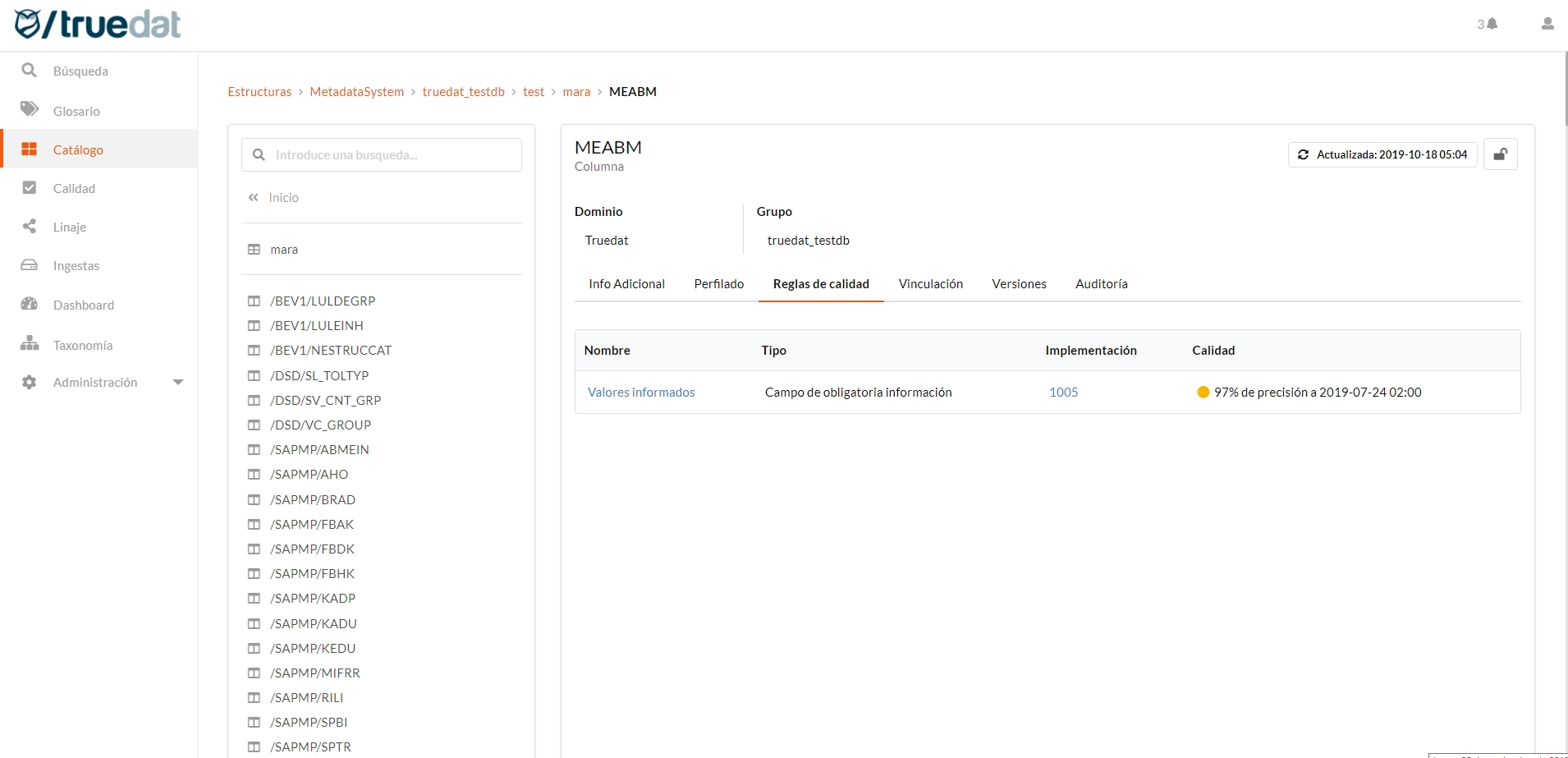 A list is shown with the quality implementations where the structure we are consulting is being referenced. Additionally, information on the rule to which this implementation belongs is displayed and navigation is allowed both for the quality rule and for the implementation to which the list refers. The last quality result will also be displayed if we have it.