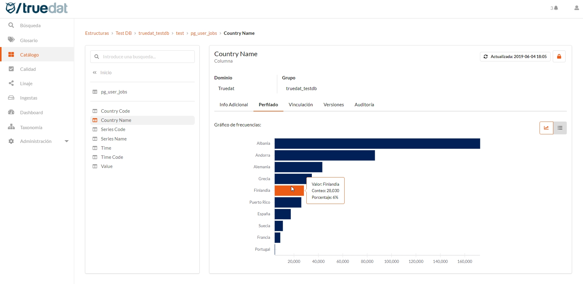 In case of having information on the distribution of values, the profiling tab will be displayed, containing a graph with the different values ​​that we have for said field.