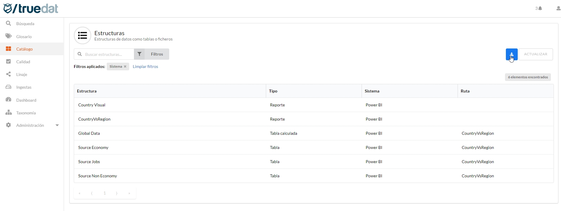 Carrying out any search or filtering within the data catalog, we will have the option of exporting the metadata information contained in the catalog in csv format, so that these data can be processed in a third Excel type application.