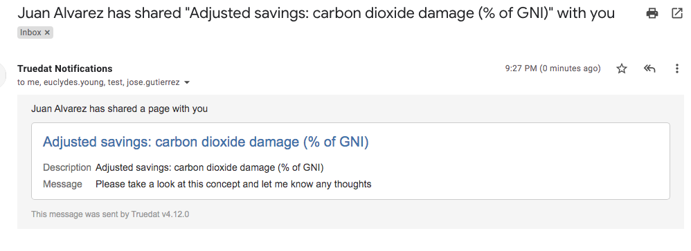 New feature to allow users to share a concept with other users in the application via email. While sharing, user will be able to select one or multiple user or a group of users. It will also be possible to include a comment explaining why the concept is being shared.