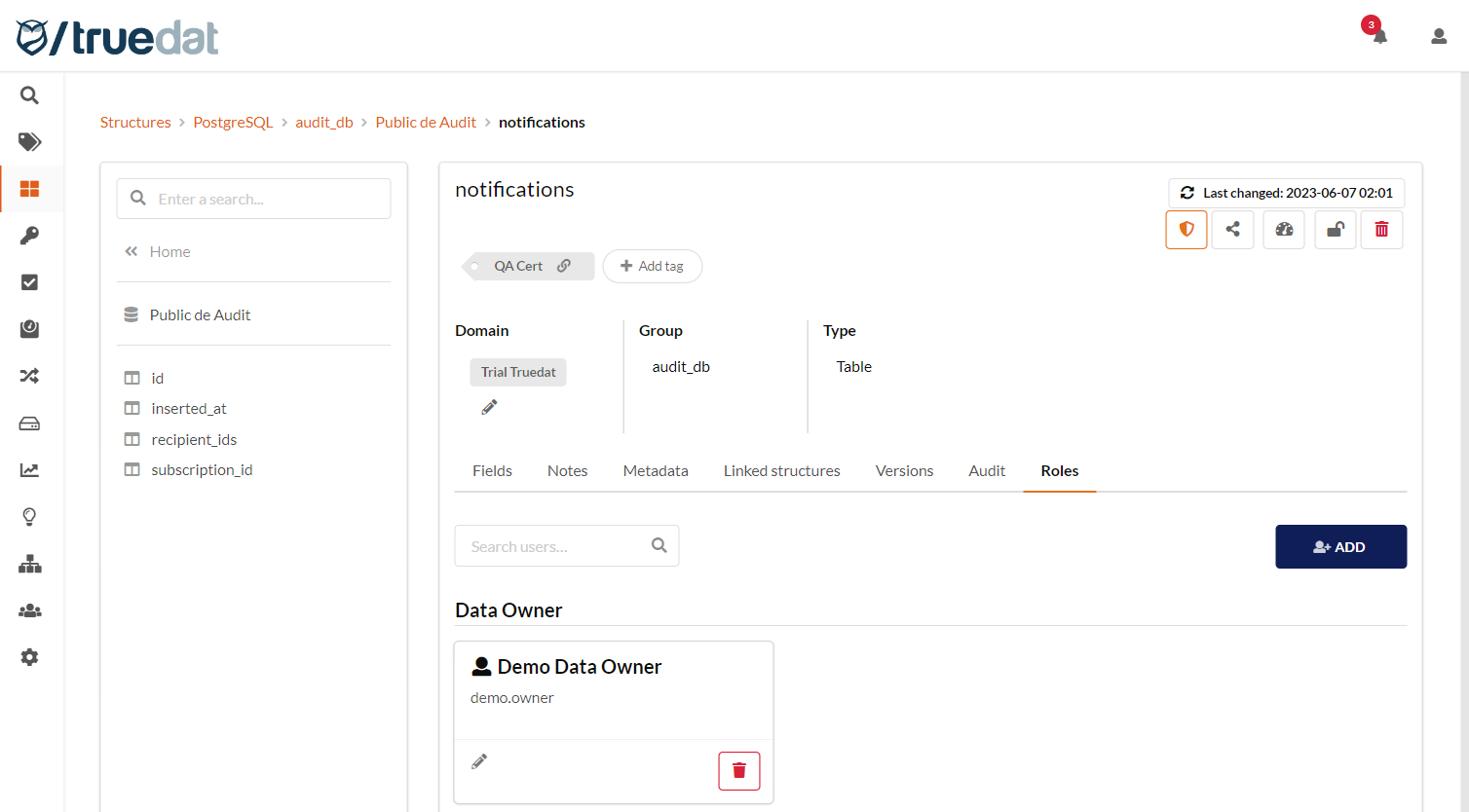 When a data consumer requests access to the structure "Table X", the grant request will have to be approve by "User B" as responsible for this specific structure.