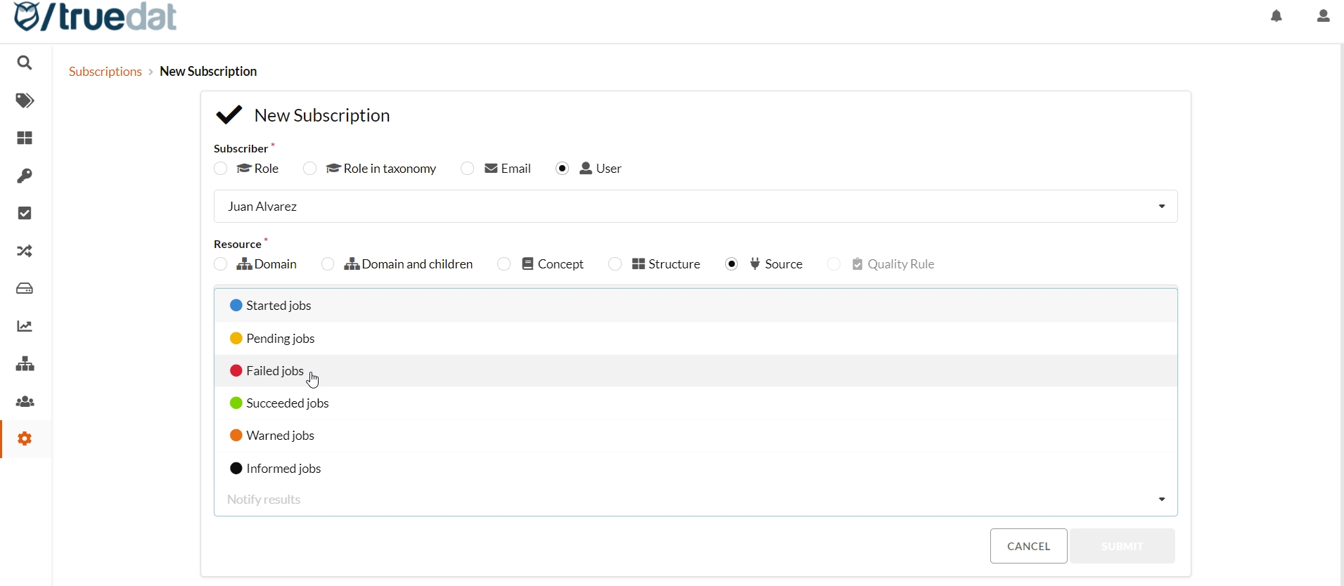 A new type of subscription is included in this version to allow to notify selected users with any specific event happenning to one of our sources. This will allow to use truedat's notification system to send emails and notify in truedat to some user in case that a connector executes or fails.