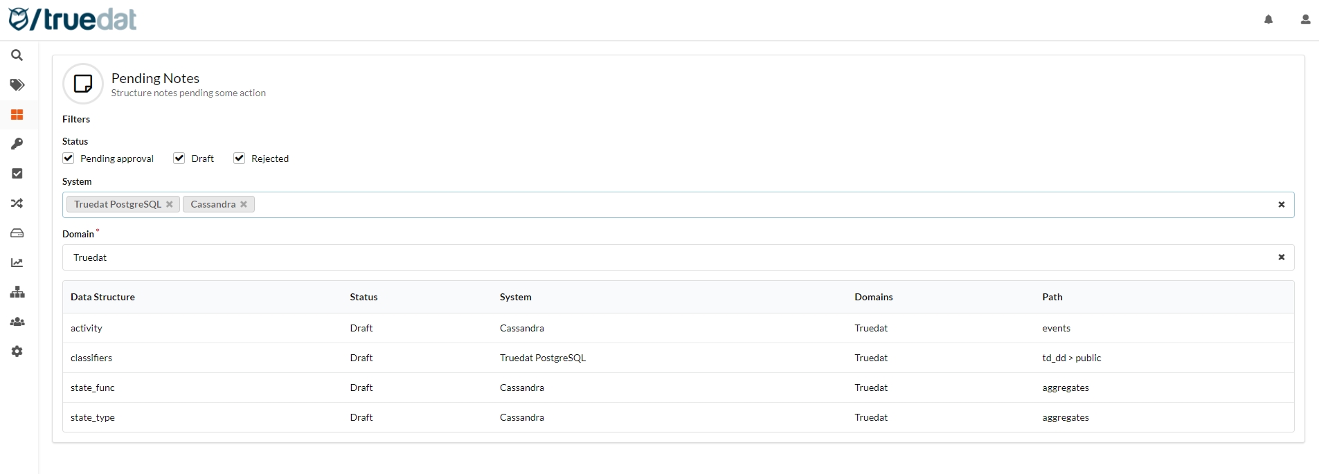 In the Data Catalog there is a new menu option to view the structure notes that are not published yet. These menu option will be visible to those users with permissions to manage notes (edit, send for approval, publish or reject) and they will view notes pending an action from them which will depend on their permissions, i.e. if the user has permission to publish/reject notes they will see notes pending approval but if the user only has permission to publish, the notes displayed will be only those in draft status.