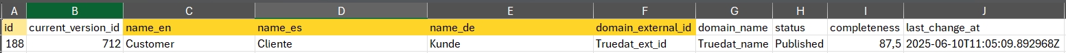 Users with permissions to manage concepts (create/edit business concepts) will be able to download and upload the concept information in multiple languages. The name and all the free text fields from the template that are subject to be translated will be downloaded in separate columns so for each of them there will be as many columns as languages set up in Truedat.
