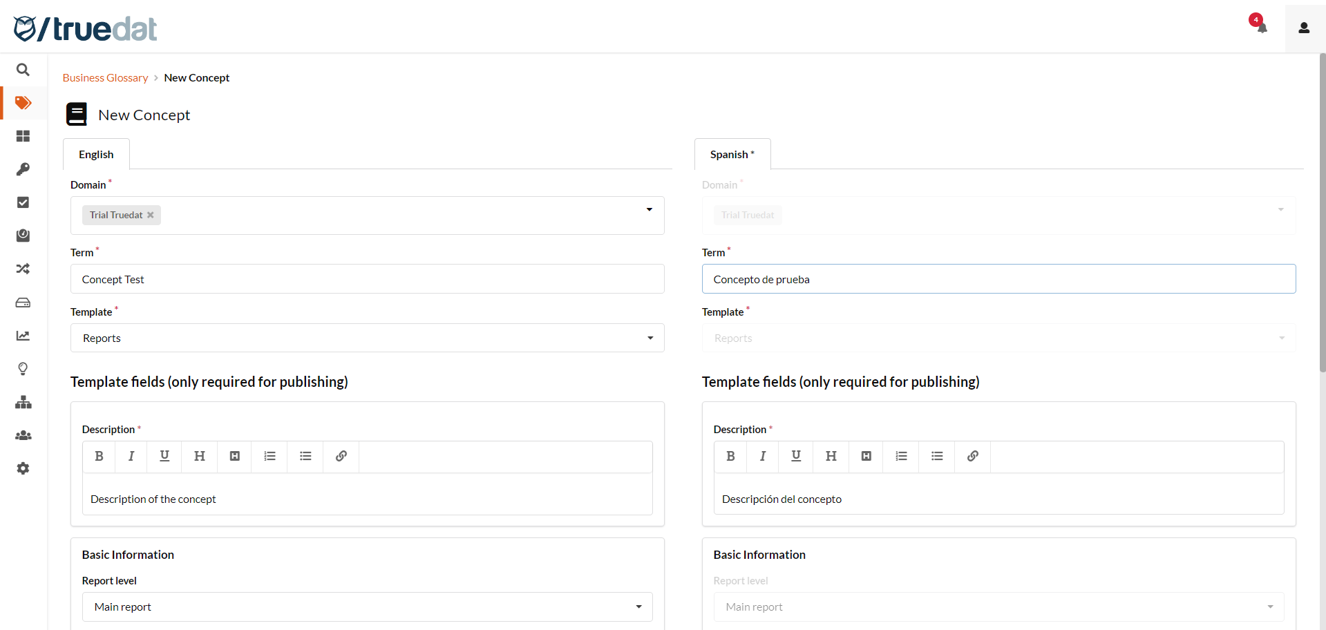 If you have set up additional languages in your Truedat installation, you will now have the ability to enter information in all those languages when creating a new business concept. Throughout the review process, from draft to publishing, the information will be displayed in all languages for reviewers to check. Once the concept is published, users will see the concept information in the language set up in their browser.