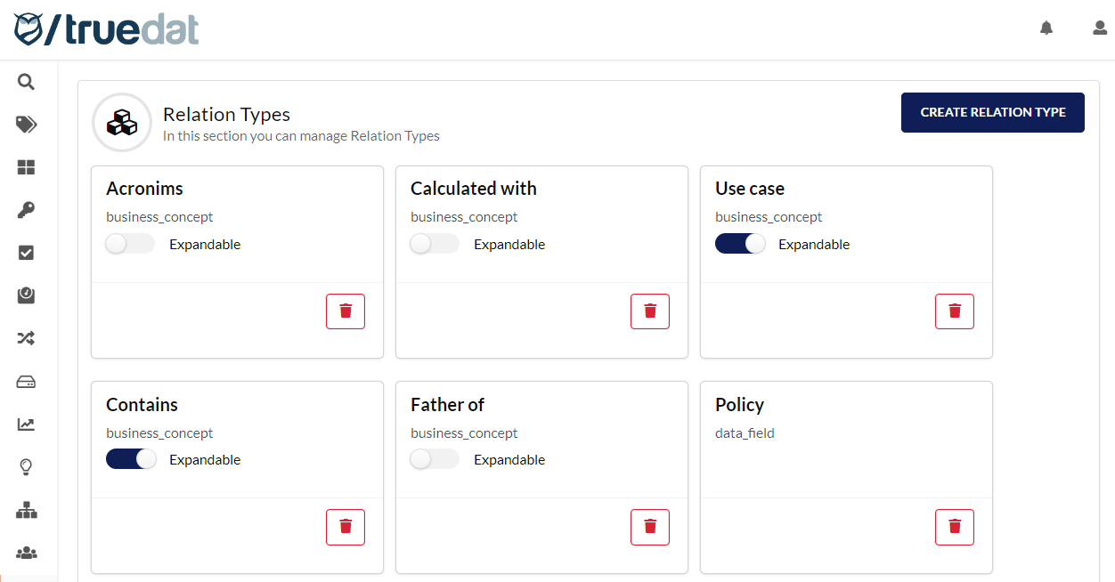 As an admin user you will be able to set up the different type of relationships that a business concept can have with other resoures. This can be done in the 'Administration' module in the 'Relations' option.