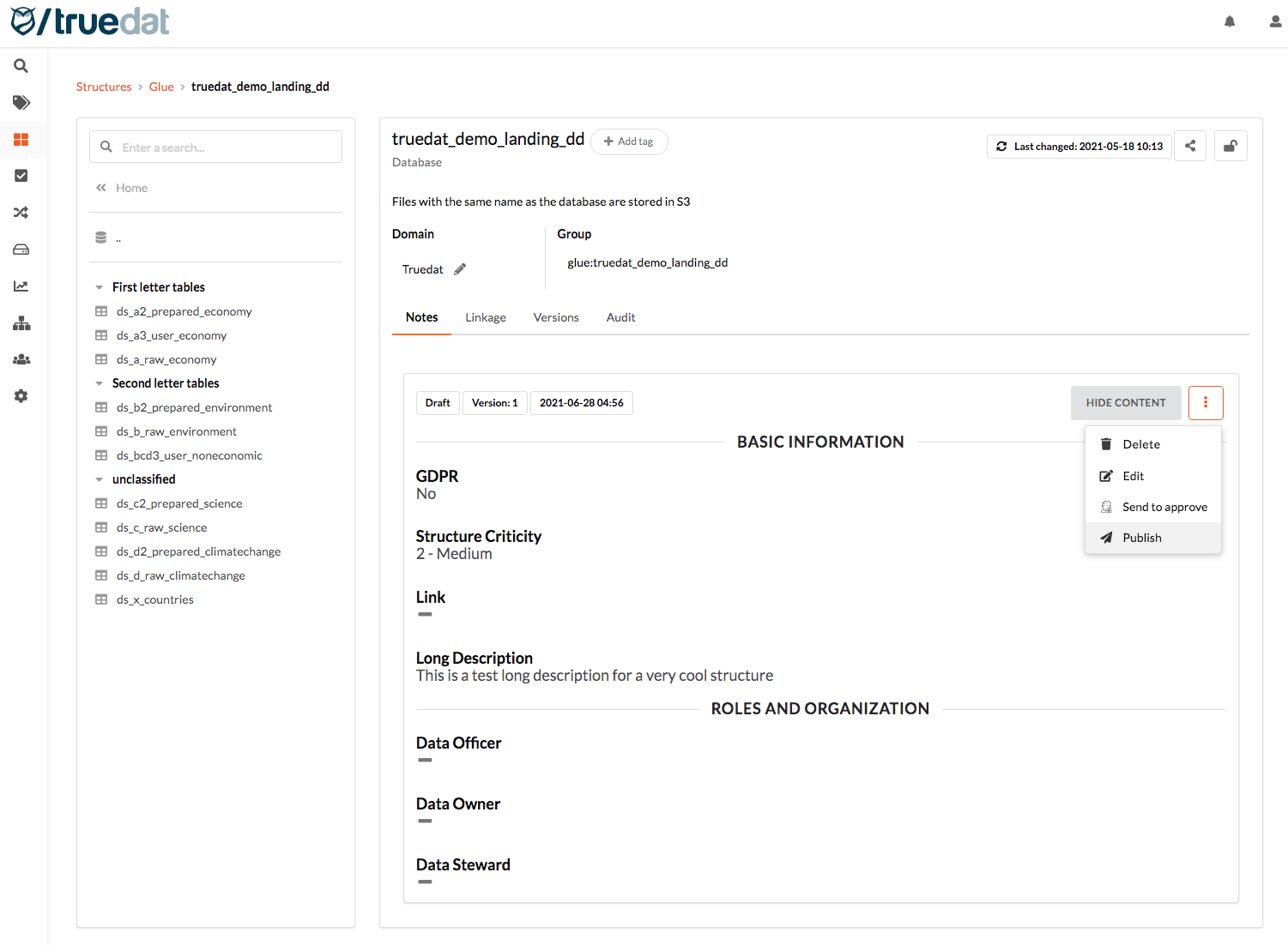 We have introduced an approval workflow for the data structures' notes (formerly known as Extra Info). A note is metadata maintained manually in Truedat and attached to a data structure. Usually this will provide information about the structure that can not be obtained automatically from the source system. Since this information is mantained manually we have found that it is important to provide an approval workflow for those clients that want to control what information is published: