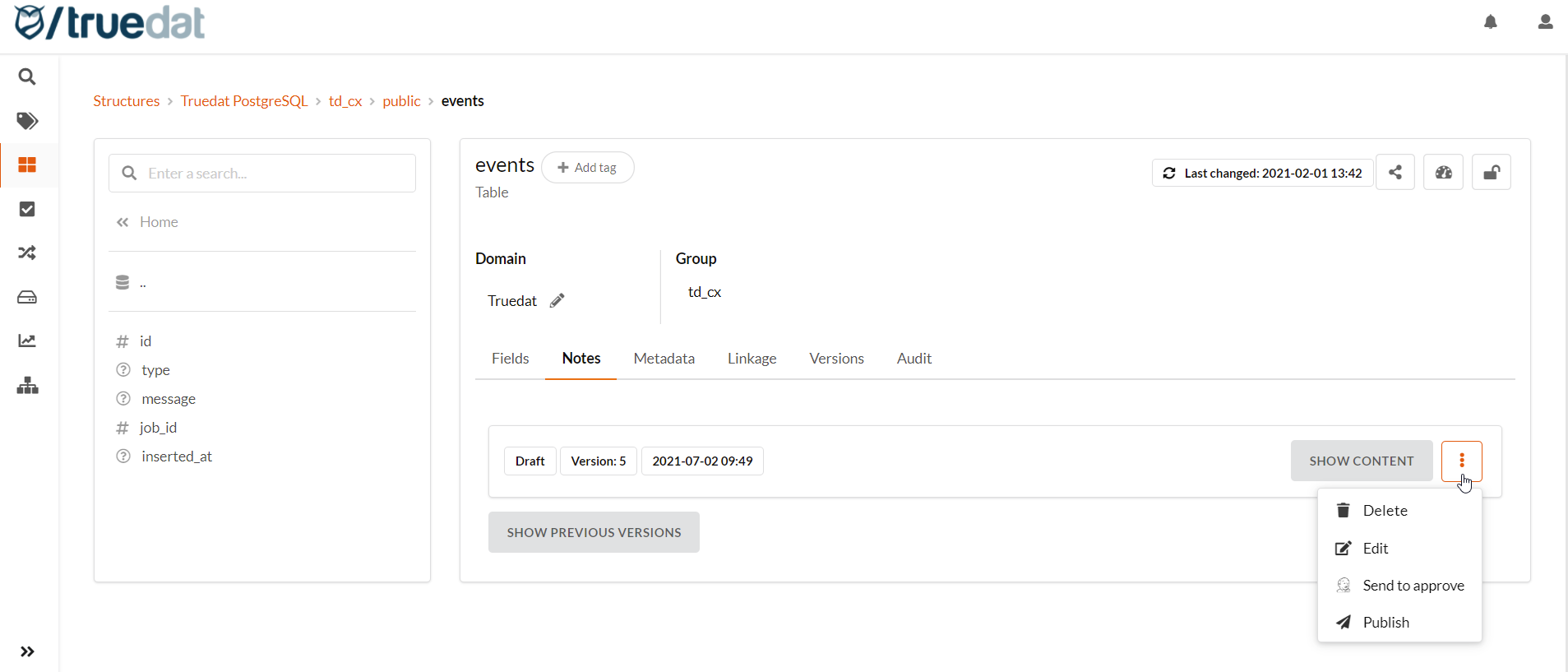 When metadata are loaded into truedat, a domain is assigned by the connector as specified in the data source. In the data catalog you will be able to reassign the domain of a specific data structure or assign it to more than one domain. This is specially important if you are planning to manage different permissions to data structures depending on the data domain the are assigned to. When changing the domain of a structure you will have the option to automatically change the domain of all its children.